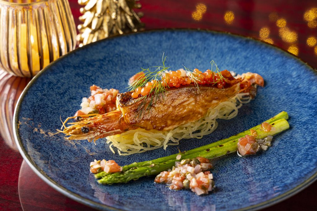 タスマニアサーモンと車エビのポワレ アジアングレイズ ケッカソース ディル トマトキャビア