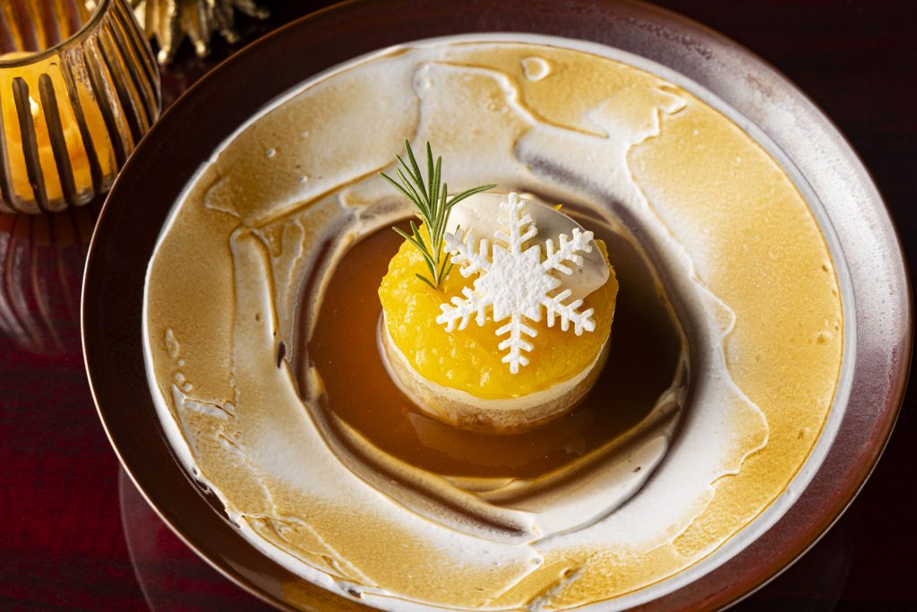 アルマニャックとコアントローのサヴァラン 雪の結晶 ローズマリームース オレンジジュレ トンカ豆のジェラート