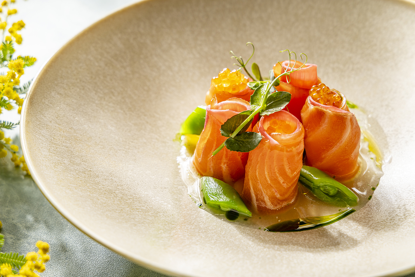 Entrée タスマニア産サーモンのグラブラックスサーモンコンソメ 春野菜