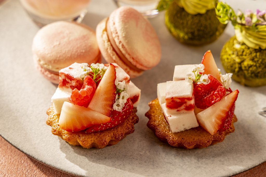 みずみずしい苺が鮮やかな「桜と苺のタルトレット」など、春の喜びを感じる美しいスイーツが並びます。